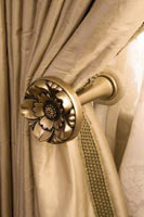 The above photos show details of (from left to right): the Inner Lace Curtains (the Lace is a cotton open weave lined in a muslin and hand-sewn.); the Braid and rolled edge; the Attached Valance and Hand-gathered Heading; the classic flower Ombra gilded tie-back.